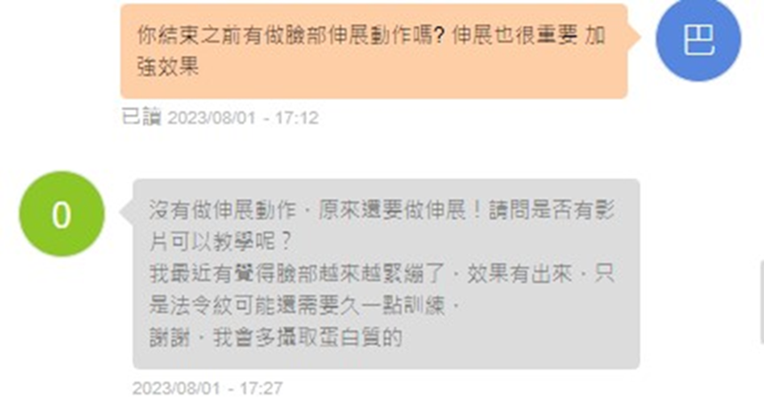 Hello, I have been using it for 3 weeks. My skin has become firmer and I don’t snore less when sleeping. The effect is quite good. However, the sagging skin has not improved yet. 2023/07/23 I would like to ask, is it possible to improve the problem of skin sagging by wearing this? There are also nasolabial folds. How long does it usually take to see the effect? Thank you 2023/07/23 Sometimes I wear it for 3-40 minutes while watching TV. Is this okay? Is there any time limit on usage? Thank you 2023/07/23 Sorry, I just read your message now. It’s okay to wear it for 3-40 minutes, as long as you don’t feel sore. Skin sagging can be improved, depending on the individual’s physique. It is recommended that in addition to using this training, you should also consume more protein. It takes a long time to improve nasolabial folds. 2023/08/01 Do you do facial stretches before completing your workout? Stretching is also important to enhance the effect. 2023/08/01 I didn’t do it, but I still need to do stretching! Is there a video that can teach me? Recently, I feel that my face is getting firmer and firmer, and the results are showing, but the improvement of nasolabial folds requires longer training. Thank you, I will eat more protein. 2023/08/01 |