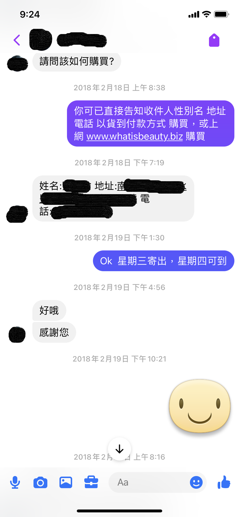 How to purchase? 2018. 2. 18 You can directly inform us the name of the recipient, address and phone number. Purchase by cash on delivery or online at www.whatisbeauty_biz 2018. 2. 18 Name Address Phone number The goods will be shipped on Wednesday and will arrive the next day. 2018. 2. 19 Ok. Thank you. 2018. 2. 19 No worries. 2018. 2. 23 |