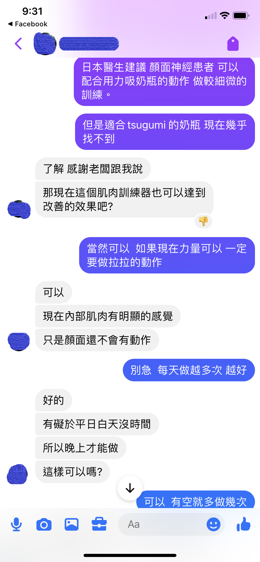 We used to sell tsugumi, place it on the cap of a baby bottle for baby training. We no longer produce it because it needs to be matched with a specific baby bottle. But I have a few in stock that I want to use for my own children. Japanese doctors recommend that patients with facial nerves damage can perform more subtle training by sucking a bottle forcefully. But it’s almost impossible to find a bottle suitable for tsugumi now. Understood, thank you for telling me. So now this muscle training device can also achieve improved results, right? Of course, if you have the strength now, you must do some pulling movements. I can. Now there is obvious feeling in the oral muscles. It’s just that the face doesn’t move yet. |