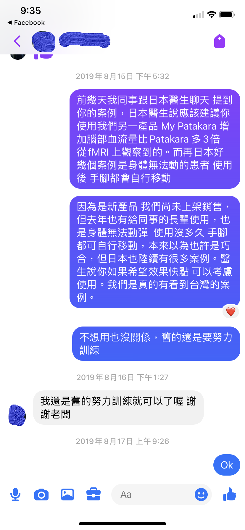 A few days ago, my colleague was chatting with a Japanese doctor and mentioned your case. The Japanese doctor said that he should advise you to use another of our products, My Patakara, increases brain blood flow 3 times more than Patakara, as observed on fMRI. There have been several cases in Japan where patients who were unable to move, could move their hands and feet on their own after using. Because it is a new product, we haven’t put it out for sale yet, but last year it was also used by the elders of colleagues, also the body cannot move, not long after using it, hands and feet can move on their own. I originally thought it might be a coincidence but there are many cases in Japan. The doctor said that if you want faster results, you can consider using it. We have really seen cases in Taiwan. It doesn’t matter if you don’t want to use it, you still need to train hard using the old one. I will just use the old one to train hard as before, thank you. Ok. |
