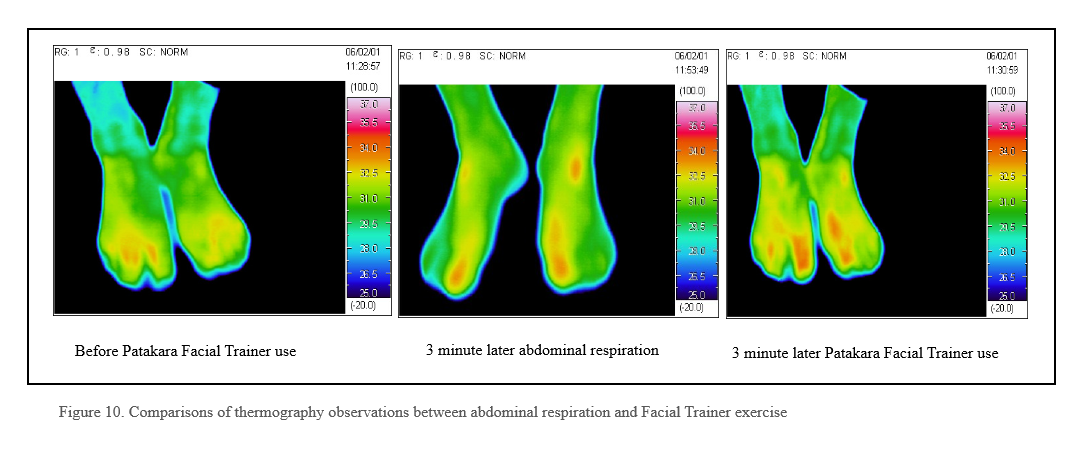 Health-conscious people are aware of the effects of the parasympathetic nerve system. Doing abdominal respiration will improve blood circulation in the arms and hands. Therefore it is popular for them to perform abdominal respiration exercises. Figure 10. Enthusiasts of abdominal respiration. After using a thermograph to measure the temperature change and comparison between cases of doing abdominal exercises or doing Facial Trainer PATAKARA exercises after three minutes, comparisons showed that Facial Trainer PATAKARA exercises were more effective in stimulation the parasympathetic nerve system of the hands and feet.