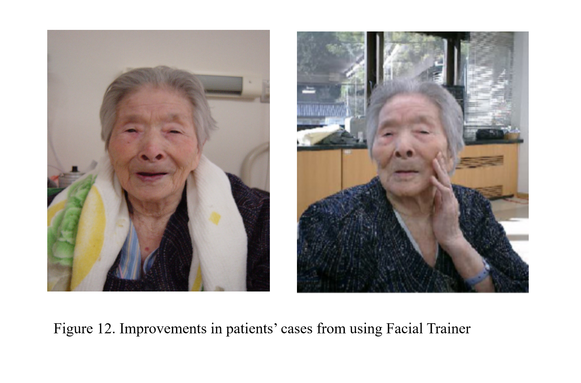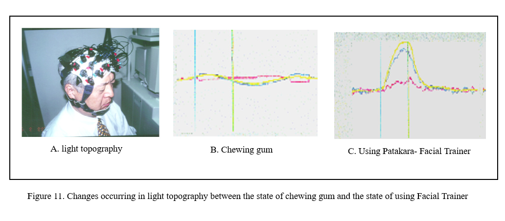 Using the light topography device from Hitachi, we can observe which region of the brain has an increase in blood circulation. Maintaining a balance in blood flow within the brain is crucial for maintaining normal brain function. The most ideal is to accumulate blood in the frontal lobe of the brain, then distributing this blood to different parts of the brain. For example, the action of using the hand to hit a table will cause a blood flow change in the temporal lobe of the brain. This shows that there is a relationship between the hand and the temporal lobe of the brain. However, this does not mean repeating the action from the hand will be able to enhance the function of the brain. In Japan’s former North-East university, Prof. Sasagi published in his thesis mentioned that in studies of swallowing, cough reflex in healthy old people, people suffering from dementia disease, and brain stroke, the results showed people with dementia disease but had otherwise healthy bodies had worse reaction ability than healthy old people. The reaction ability of people with brain stroke was the worst out of the three groups of people studied. This means that the better the brain functions, this will result in improved reaction ability. This also means that conditions we commonly associate with aging are also associated with a decrease in brain function (blood flow decrease). Normal Japanese people believe, regularly chewing/biting things can prevent the development of dementia disease and similar symptoms. To prove the truth in this belief, we have asked five dentists to assist in this investigation. Firstly, let them practice using masticatory muscles (to stimulate the muscles controlled by the trigeminal nerves) while chewing gum. Then ask them to continue chewing gum while using light topography to monitor blood flow in the frontal lobe of brain. Figure 11a. The result is there is not change in blood flow. Figure 11b. When they use Facial Trainer PATAKARA facial training (stimulating facial nerves and associated muscle groups), the blood flow in the right side of the frontal lobe increased dramatically. Figure 11c. This results shows that chewing things is unable to cure dementia disease and similar symptoms. However, increasing lip-shutting strength can cure dementia disease. Figure 12. An 87 year old suffering from serious dementia disease. Here showing the effects after using Facial Trainer PATAKARA (dementia disease symptoms were completely cured after 8 months and the patient released from hospital).