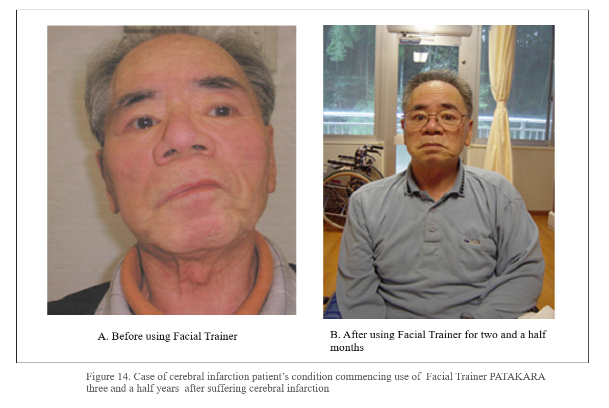 Figure 14a. 74 years old male. Stroke patient after stroke for three years, abnormal over-salivation, and swallowing difficulty and has articulation disorders. Although after stroke normal oral rehabilitation exercises were performed, there were no improvements. Figure 14b. After using Facial Trainer PATAKARA for 2 months, improvements are clearly seen. Lip and oral cavity exercises, especially training lip and mouth muscles, will easily lead to the perception that the cure of various symptoms is due to the actual training of the muscles involved in the exercise. As mentioned above, muscle movement is controlled by the brain, and that is the critical effect of the exercise. So it is due to the muscle exercises which have affected brain activity in the right frontal lobe of the brain, that have lead to an improvement in overall brain function. Traditional rehabilitation patients have focused training on the body part which has lost function; however, the loss of function is not due to the particular body part, but due to the brain’s inability to control the body part.