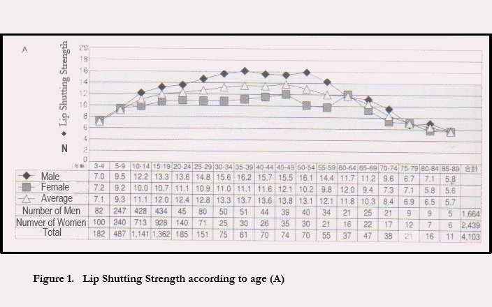 Figure 1, The lip-shutting strengths of various age groups, and the device for measuring lip- shutting strength