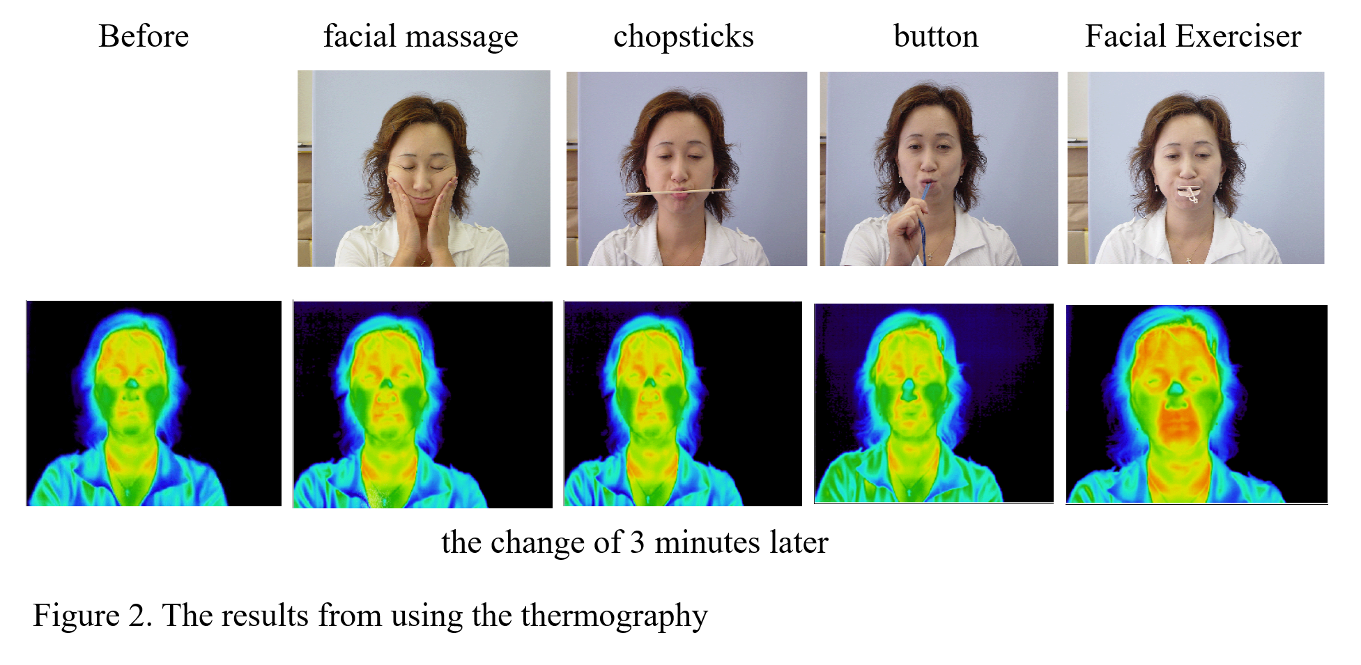 The key to training mimic muscles is to first understand the differences between mimic muscles and skeletal muscles and then to apply stimulation in a correct manner and train these muscles regularly on a daily basis. Skeletal muscles are connected to bones at either end. It is a type of muscle where the effects of training are quickly seen (mimic muscles are connected to bones at one end and attached to muscle or skin at the other end). Thus, there is a disadvantage of the whole muscle being moved once one end is moved. In order to accelerate the effects of training mimic muscles, it is possible to use a palm to press against one cheek to achieve the same conditions of skeletal muscles. The final aim is to clearly expose the sternocleidomastoid muscle and collar bone. Using the thermography device, it is possible to observe the effects of exercise on this group of muscles. Figure 2. Without being able to immobilise one end of the muscle, it is not possible to perform effective exercise on these muscles which results in increasing muscle temperature. Without an effective exercise, it is not possible to recover the elasticity and firmness and achieve anti-aging effects on the mimic muscles. The main point to enable us to clearly see the facial shape and muscle tone is to continually and regularly exercise these muscles until the collar bone can be clearly seen. This will enable an appearance of youth and beauty. Apart from doing regularly exercise, in addition to using Facial Trainer PATAKARA in training, using fingers to slightly pinch the sternocleidomastoid muscle, this will enable even more rapid development of the effects of training. Effects from the training can be observed in 2 months at the latest. Figure 3-5. If clinical staff are able to show and preview to patients the patients’ state before and after treatment to give the patient more confidence in the treatment, this will enable even better effects and results from treatment.