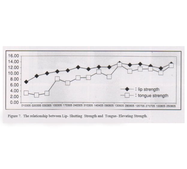 Next, will be a discussion on how to judge the strength of our own mimic muscles. Firstly, let’s see the lip-shutting strength and position of the tip of the tongue. If the tip of the tongue can constantly touching the upper jaw behind the front teeth, this means that the lip-shutting strength is sufficiently strong and is healthy. If the tip of the tongue is constantly touching the lower jaw behind the front teeth, this means that the lip-shutting strength is insufficient and may have adverse health effects. Figure 6. When the Orbiscularis oris muscle shutting strengths have increased, the strength for the tongue touching the upper jaw will also increase (the pressure of the tongue raising up). When this strength is sufficient, this will enable the mouth to stay closed and maintain nasal respiration, even during sleep. Some people think that respiration through the nose is controlled by habit and intention. If this were really true, then how do we explain snoring and salivating during sleep? Through training Facial trainer PATAKARA of the oral cavity and its effects to promote respiration through the nose; these changes to the natural body function are very important.