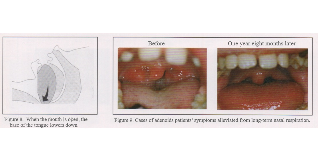 Figure 9. The result from a child’s increase in lip-shutting strength, leading to development of nasal respiration instead of oral respiration. This is the decrease in inflammation of the tonsils due to the flow of moist, warmer air coming from nasal respiration (figure on left is oral respiration, figure on right is after using Facial Trainer PATAKARA for 1 year and 8 months). Before finding a cause and solution to the lack of oxygen in the body, all theories and perceptions on anti-aging are speculative. So before doing anti-aging, first oral respiration must be changed to nasal respiration to remediate snoring, problems caused by the upper respiratory tract and sleep apnea syndrome.