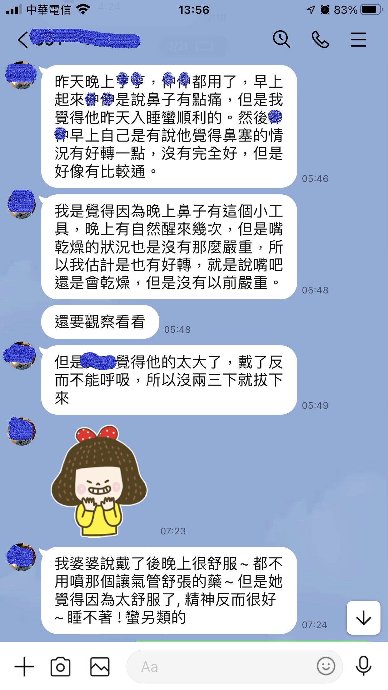 Hen and Chong both used it last night. When Chong woke up in the morning, he said that his nose hurt a little bit but I think he fell asleep quite smoothly last night. Then in the morning, he said that he felt that his nasal congestion was better, not completely but it seemed to be relatively clear. For me, because I have this device on my nose at night, I wake up naturally a few times at night, but the dryness of my mouth is not that serious, so I guess it has also improved, that is, my mouth it will still be dry, but not as severe as before. Still have to observe. But Chek felt that his device was too big and he couldn't breathe while wearing it, so he took it off. My mother-in-law said that she felt very comfortable at night after wearing it - she didn't need to spray the medicine that makes the trachea comfortable - but she felt that because it was so comfortable and more refreshed - she couldn't sleep! It's quite unique. |