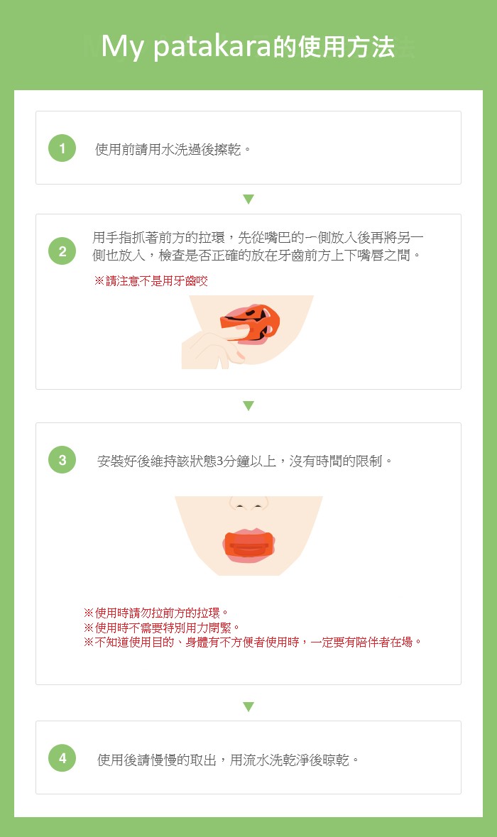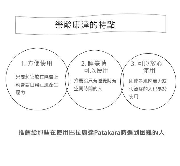 樂齡康達My patakara My patakara 表情肌訓練器[my patakara(口唇肌力維持裝置)]適用於日本長照介護度4~5患者 MY PATAKARA 商品名 MY PATAKARA(口唇肌力維持裝置) 內容物: my patakara 材質:彈性纖維 注意事項: 對橡膠過敏者、鼻腔粘膜較弱者請勿使用 務必有看護者在場時使用